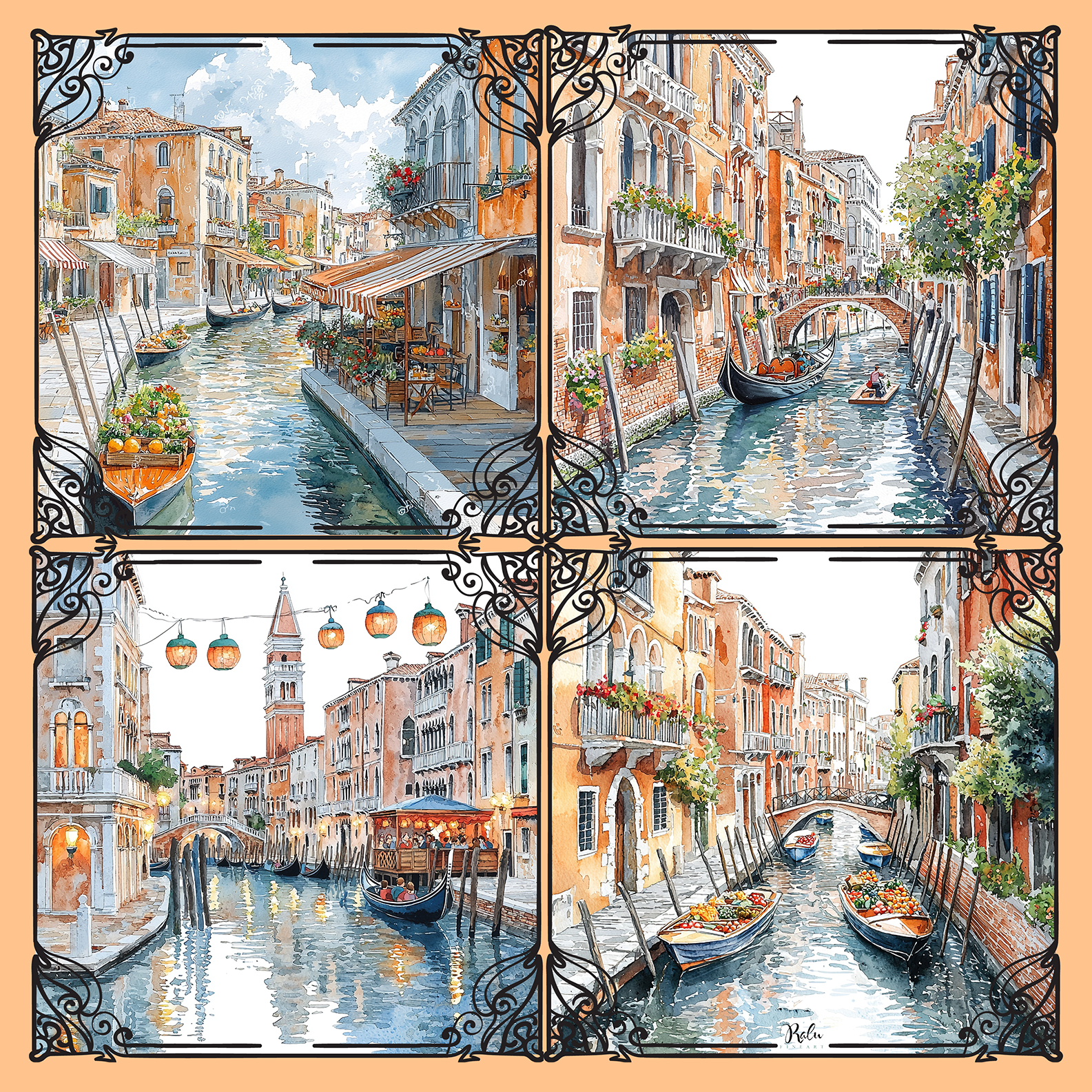 each revealing a different rhythm of the city. Winding waterways, stone bridges, softened façades, light drifting across water at different hours of the day. Each scene captures Venice not as a destination, but as a feeling - slow, reflective, and intimate.